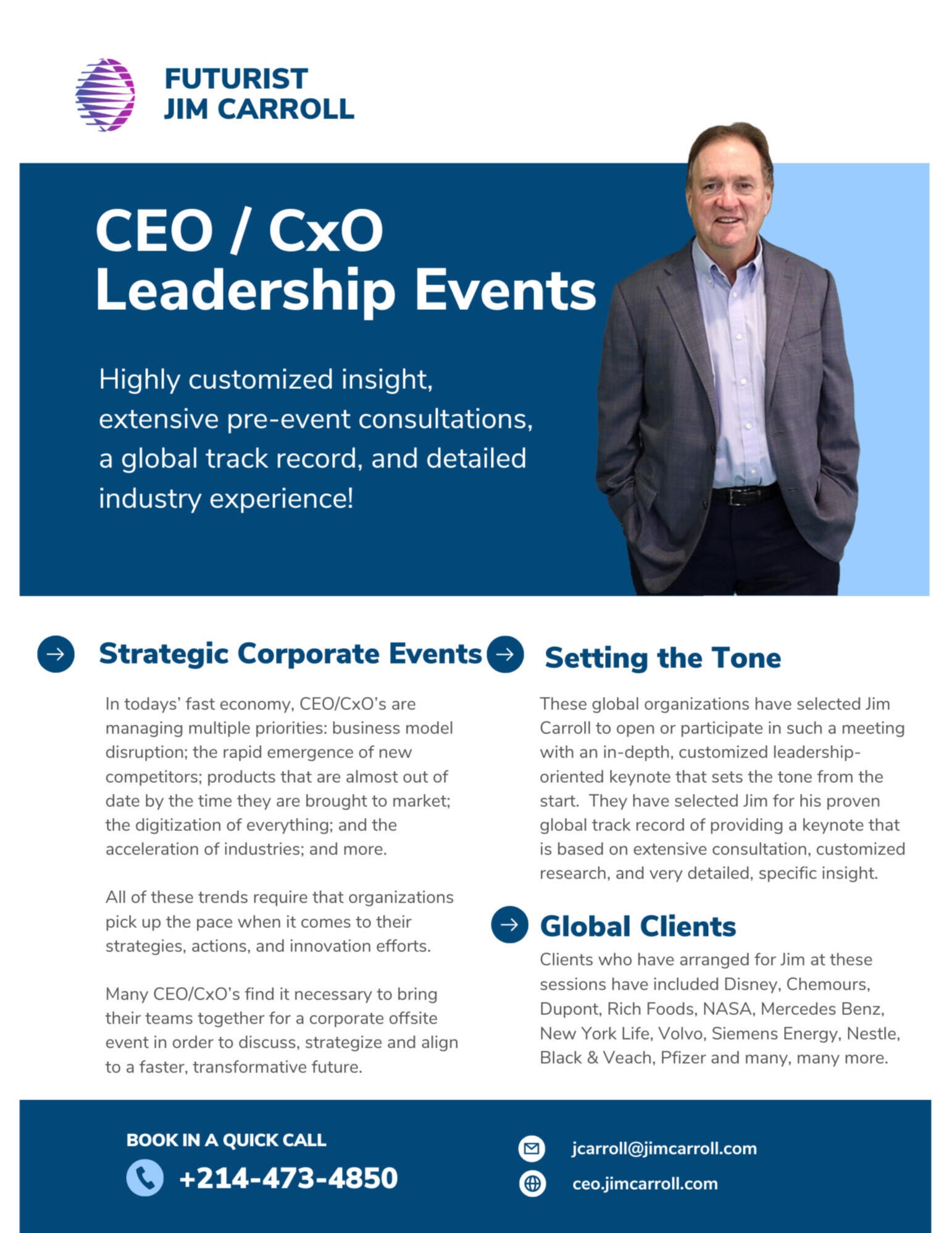 Jim Carroll will provide you with the detailed, extensively researched, highly customized disruptive trends and innovation insight that you need – on the future trends & innovation topic you require within your specific niche.He is known globally for his ability to provide concise, detailed insight for offsite CEO or CxO leadership events, and has been doing this for close to 30 years.His talks are based on extensive, original research, specific to your issues, strategies, and leadership requirements.Jim offers strategy, insight, and reality – not hype.This is what we will bring to your meeting or event.